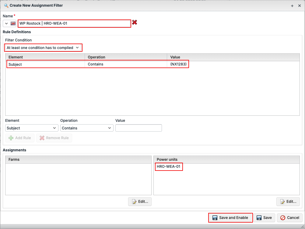 In addition to specifying the subject, it is also important to specify the park/plant assignment so that rotorsoft only processes messages that could be assigned to a plant after a positive trigger of an assignment filter.