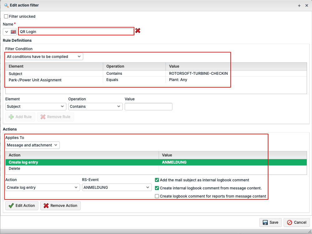 To do this, we create an action filter that contains the unique characteristics for a login and logout, e.g. the subject “ROTORSOFT-TURBINE-CHECKIN” for a login and “ROTORSOFT-TURBINE-CHECKOUT” for a logout.