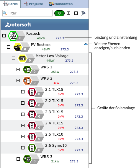 Windenergieanlagen sind nach dem festen Schema Portfolio — Park — Anlage organisiert. Eine Solaranlage gliedert sich hier auf derselben Ebene wie Windenergieanlagen ein. Allerdings können unterhalb der Ebene Solaranlage weitere Ebenen existieren, die die Geräte der Solaranlage darstellen.