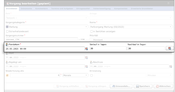 Schon beim Errichten hat eine Anlage einen Zeitplan für Wartungsarbeiten über die komplette Laufzeit hinweg. Entsprechende Vorgänge mit geplantem Start können in rotorsoft angelegt werden, jedoch erfordert die Wartungsplanung eine gewisse Unschärfe für die Durchführung der Arbeiten. Die Vorgaben für eine Jahreswartung können zum Beispiel einen Start ab einen Monat vor und ein Ende bis einen Monat nach dem Plandatum vorsehen.